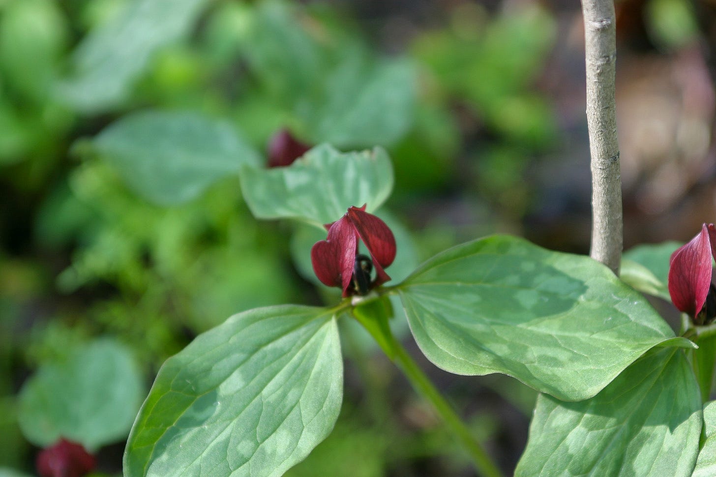 Next to a fallen tree, a lone Dutchman’s breeches plant displayed its strange little flowers—tiny pairs of pants hanging upside down on an invisible clothesline. The pale green, lacy leaves looked like they belonged in a carefully arranged flower display, not dropped casually along a trail.