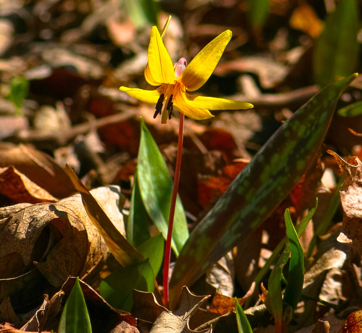 Strolling along the creek, I saw trout lilies poking their mottled leaves through the dried debris of the previous generation. A single overachieving plant had hoisted its inverted yellow flower above the masses of its brethren on a stalk resembling a shepherd crook. The tiny, succulent heart-shaped leaves of wild ginger stood nearby like a crowd of bystanders watching the flower show.